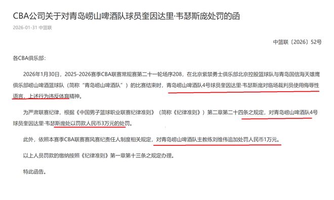 根据CBA联赛的相关规则,对青岛队外援奎因达里·韦瑟斯庞开出了一份30000元的大罚单。与此同时, 青岛队主教练刘维伟负有球队管理责任,根据CBA规则,对刘维伟罚款10000元。