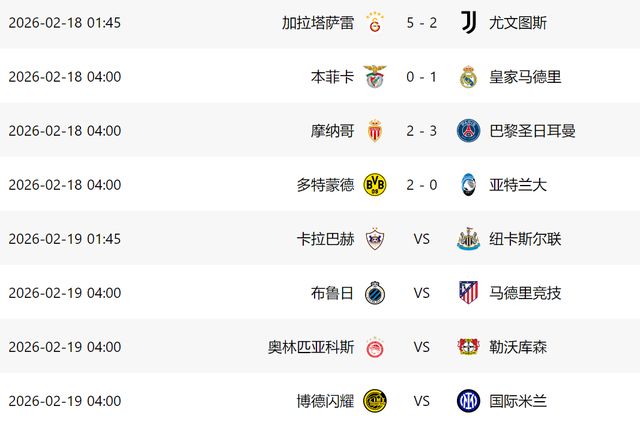 - 2026年02月19日 欧冠-勒沃库森2-0奥林皮亚科斯占先机 希克双响波库失单刀