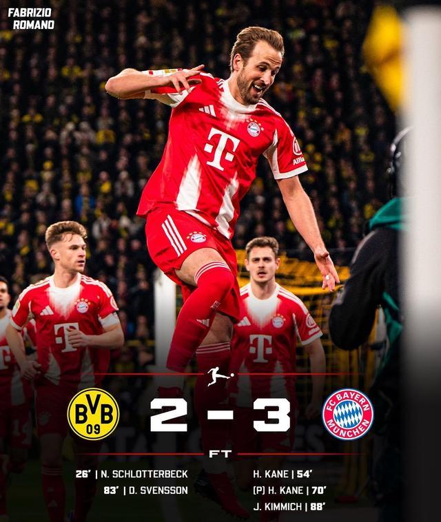凭借凯恩的梅开二度和基米希的凌空破门,拜仁3-2逆转绝杀,完成赛季双杀多特,以11分优势领跑德甲,24轮狂轰88球!